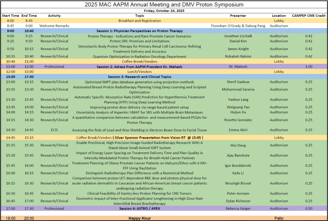 The Mid-Atlantic chapter of the AAPM and the DMV Proton Symposium group are combining our efforts this year to host a joint two-day conference on October 24th – 25th at MedStar Georgetown University Hospital in Washington D.C.