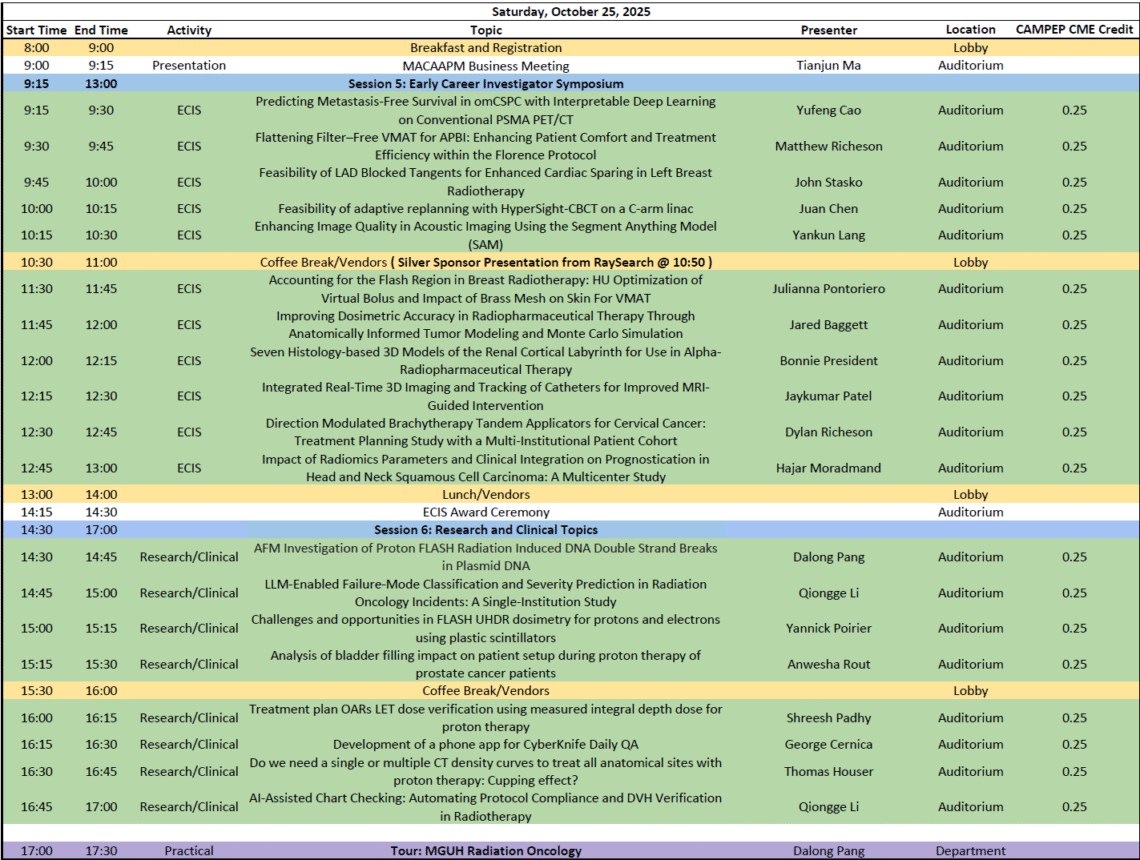 The conference will focus on a broad range of topics in radiation therapy with a special focus on medical physics and proton radiotherapy. It will include the 2025 MAC-AAPM Young Investigator Symposium and the MAC-AAPM business meeting. We are also very excited to have an address from the current AAPM president Dr. M. Mahesh, who hails from our local chapter. CE credits will be granted via CAMPEP. Food and drink will be provided. A Friday night social event will be held on the patio outside the auditorium with food and an open bar.